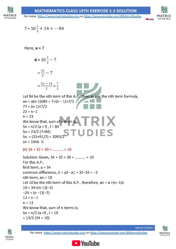 (ii) 34 + 32 + 30 + … + 10